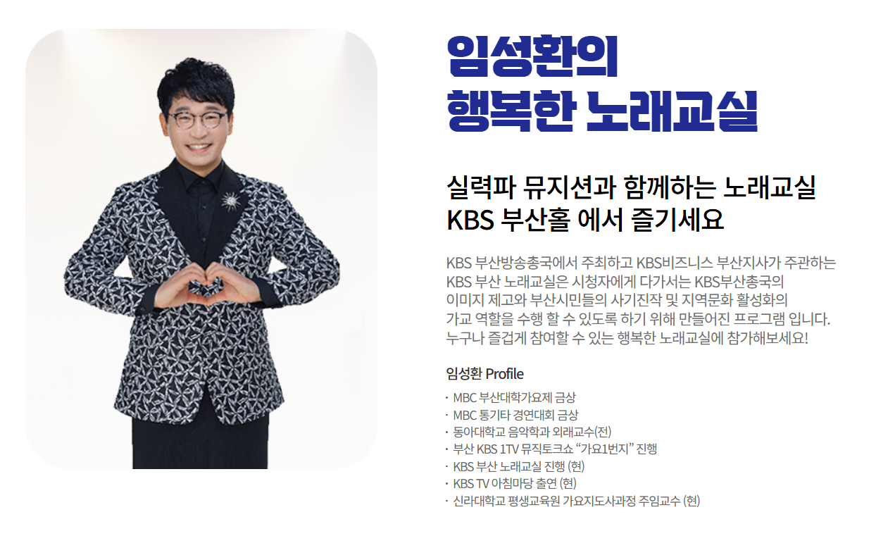 KBS 부산 임성환 강사의 노래교실은 부산 지역에서 인기 있는 시니어 대상 문화 프로그램입니다. 임성환 강사는 독특한 교수법과 친근한 매력으로 많은 수강생들에게 사랑받고 있으며, 단순한 노래 교육을 넘어 건강한 사회활동과 문화생활을 제공합니다.