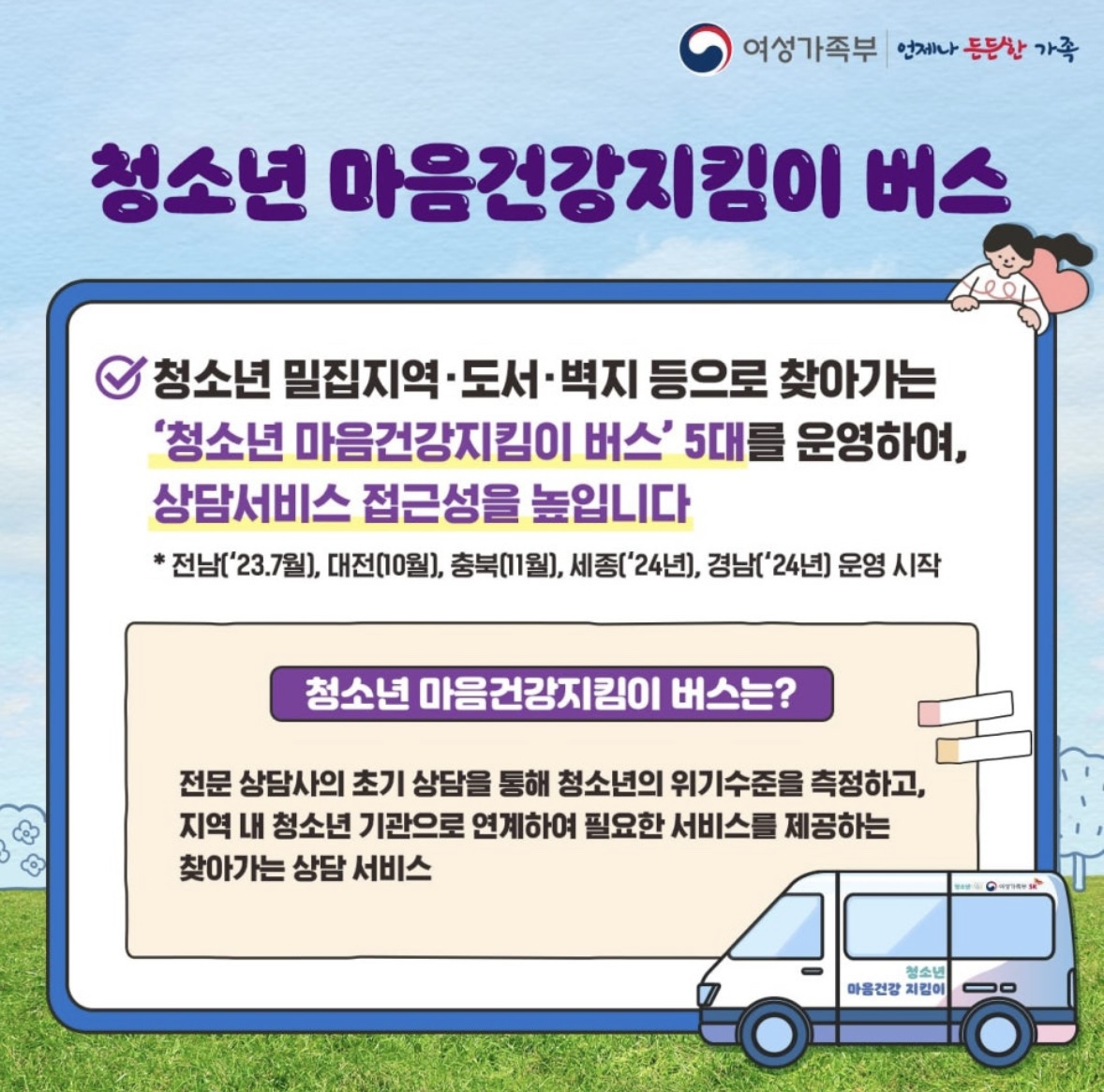청소년들이 마음의 어려움을 겪을 때, 직접 찾아가서 상담과 지원을 제공하는 서비스입니다. '찾아가는 청소년 마음건강지킴이버스'를 이용하면 다양한 도움을 받을 수 있습니다.