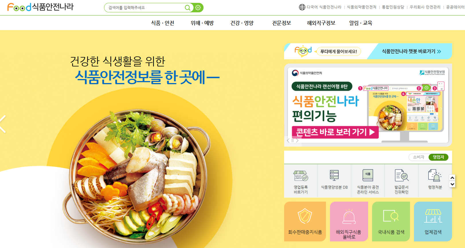 식품안전나라는 식품의약품안전처에서 운영하는 대한민국 대표 식품안전정보 포털입니다. 소비자들에게 믿을 수 있는 식품안전 정보를 제공하고, 식품 관련 불만이나 신고를 접수받는 창구 역할을 하고 있습니다.