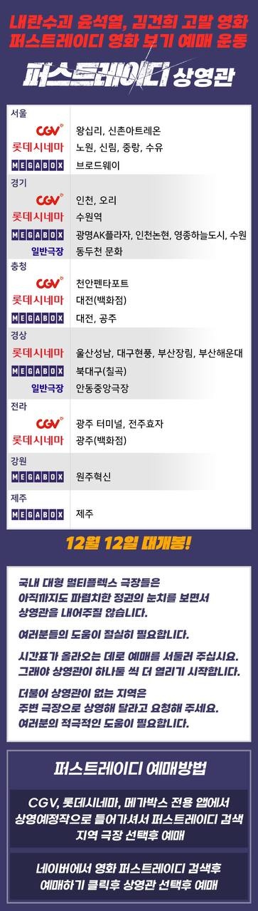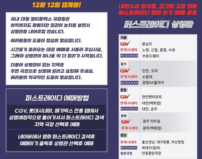 현재 '퍼스트레이디'의 예매는 CGV와 롯데시네마, 메가박스 등 주요 영화관에서 진행되고 있습니다. 국민들의 염원에 따라 상영관이 늘어나고 있으니, 상영관 정보는 업데이트 되는 대로 반영해 드리겠습니다.